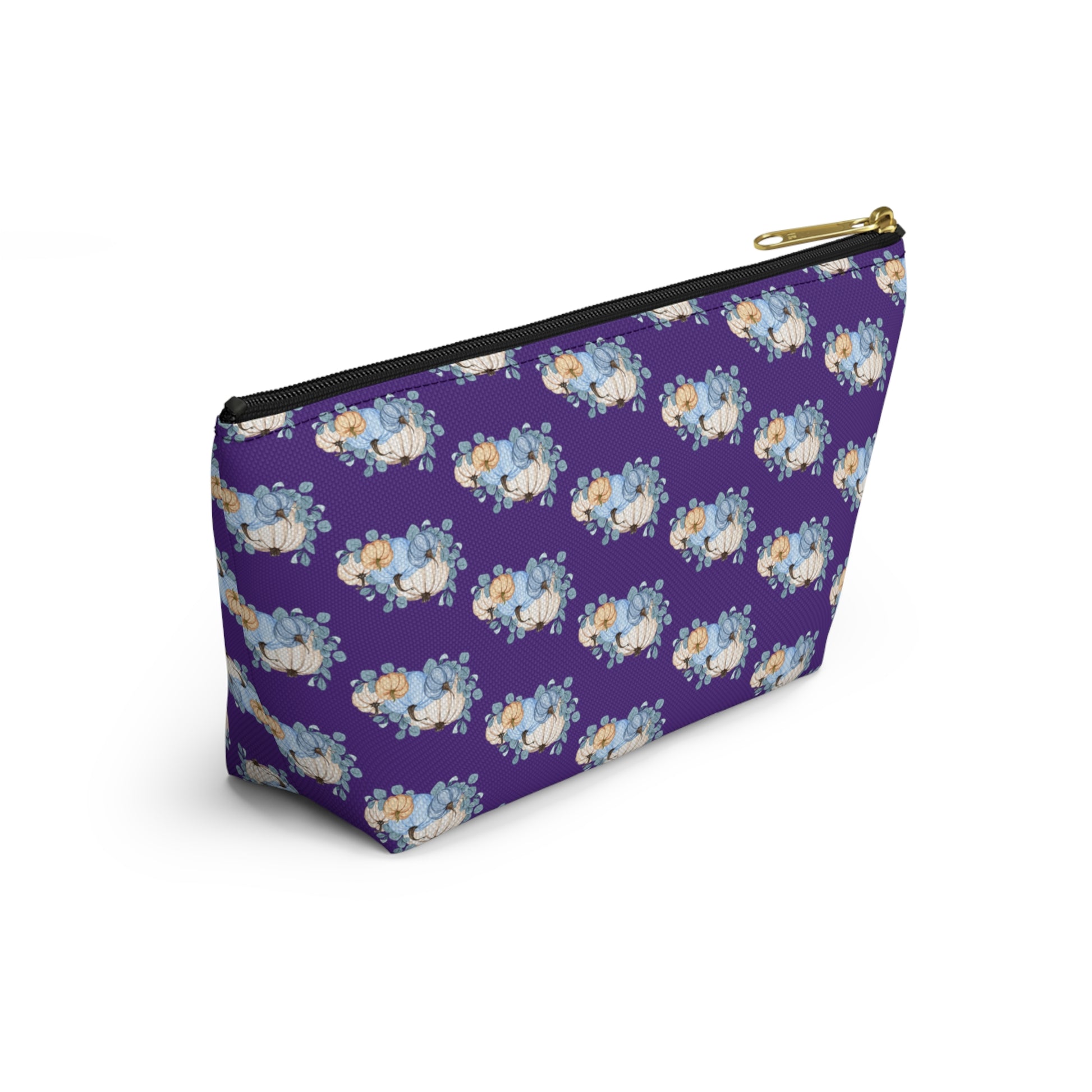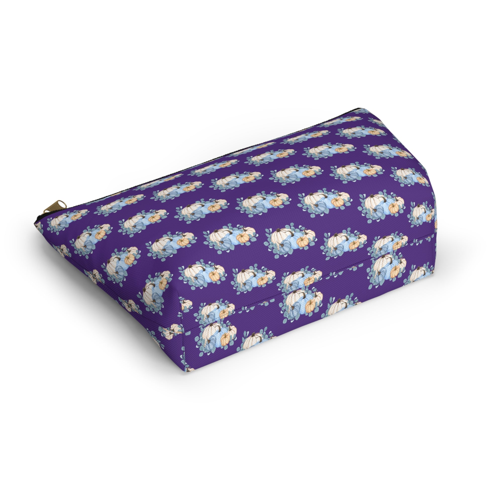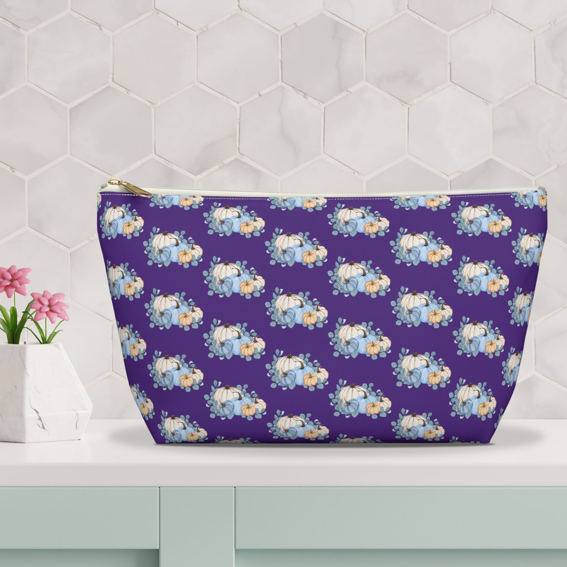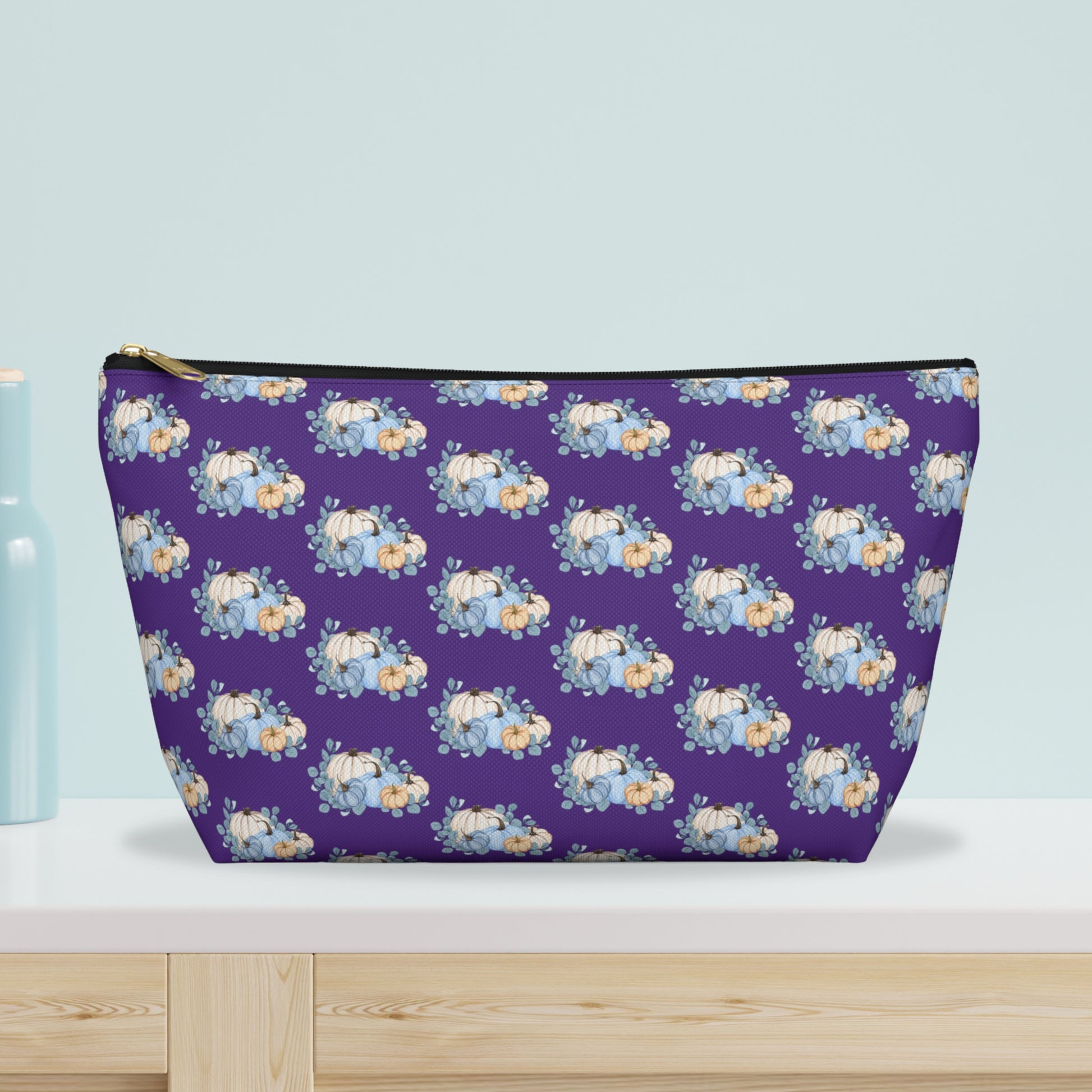 Introducing our Fall Pumpkin Stack T-Bottom Zippered Pouch, a delightful accessory that adds a touch of charm to your everyday life. This pouch features an all-over repeating print of a stack of five pumpkins in shades of cream, orange, and blue, adorned with blue-green leaves. It's not just an accessory; it's a work of art that celebrates the beauty of fall.