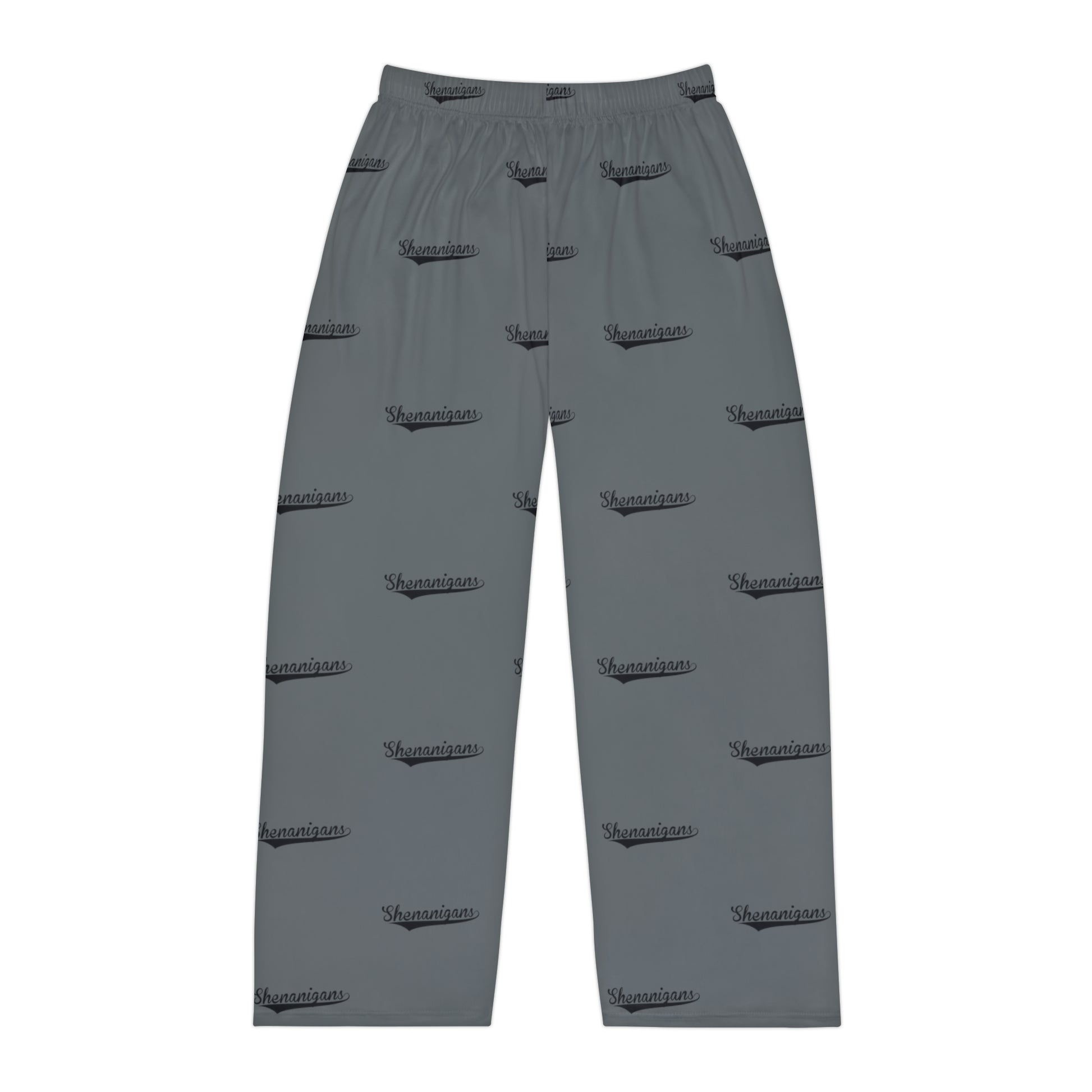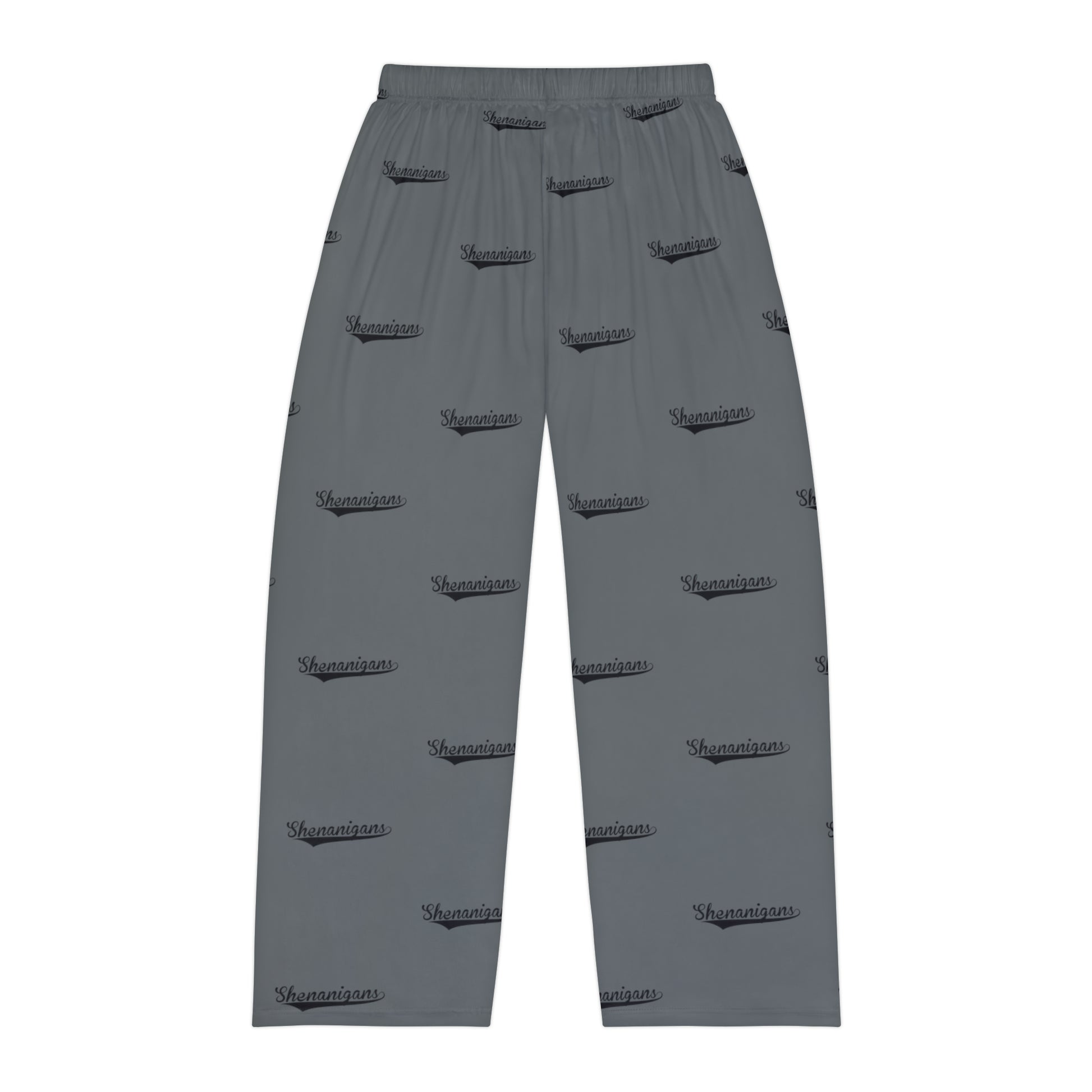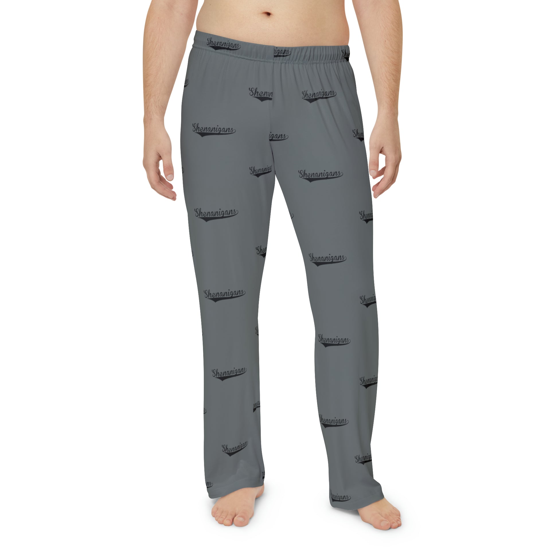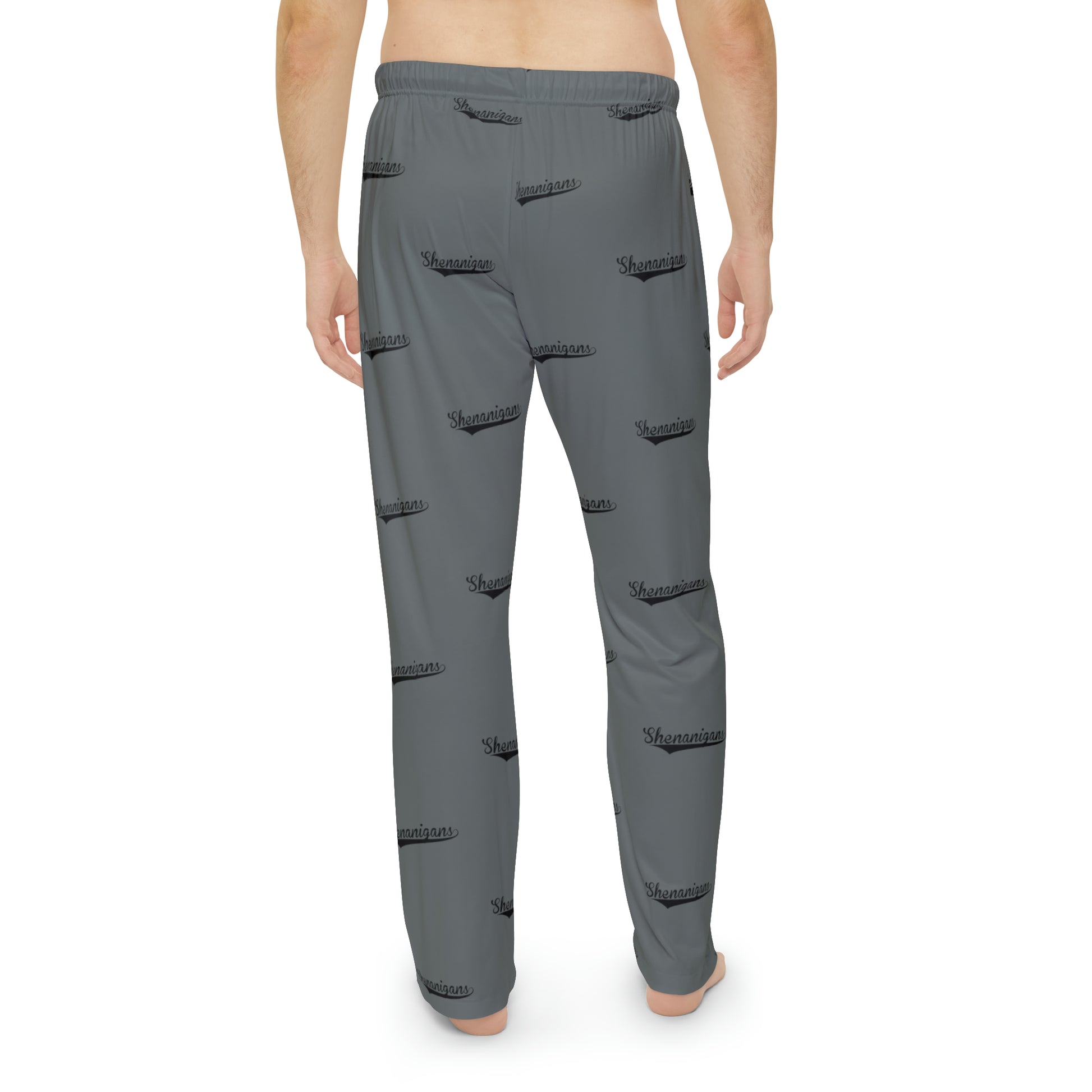 Shenanigans Men's Pajama pants bottoms in dark grey with black text. Funny shenanigans PJ's, St. Patty's day pants.