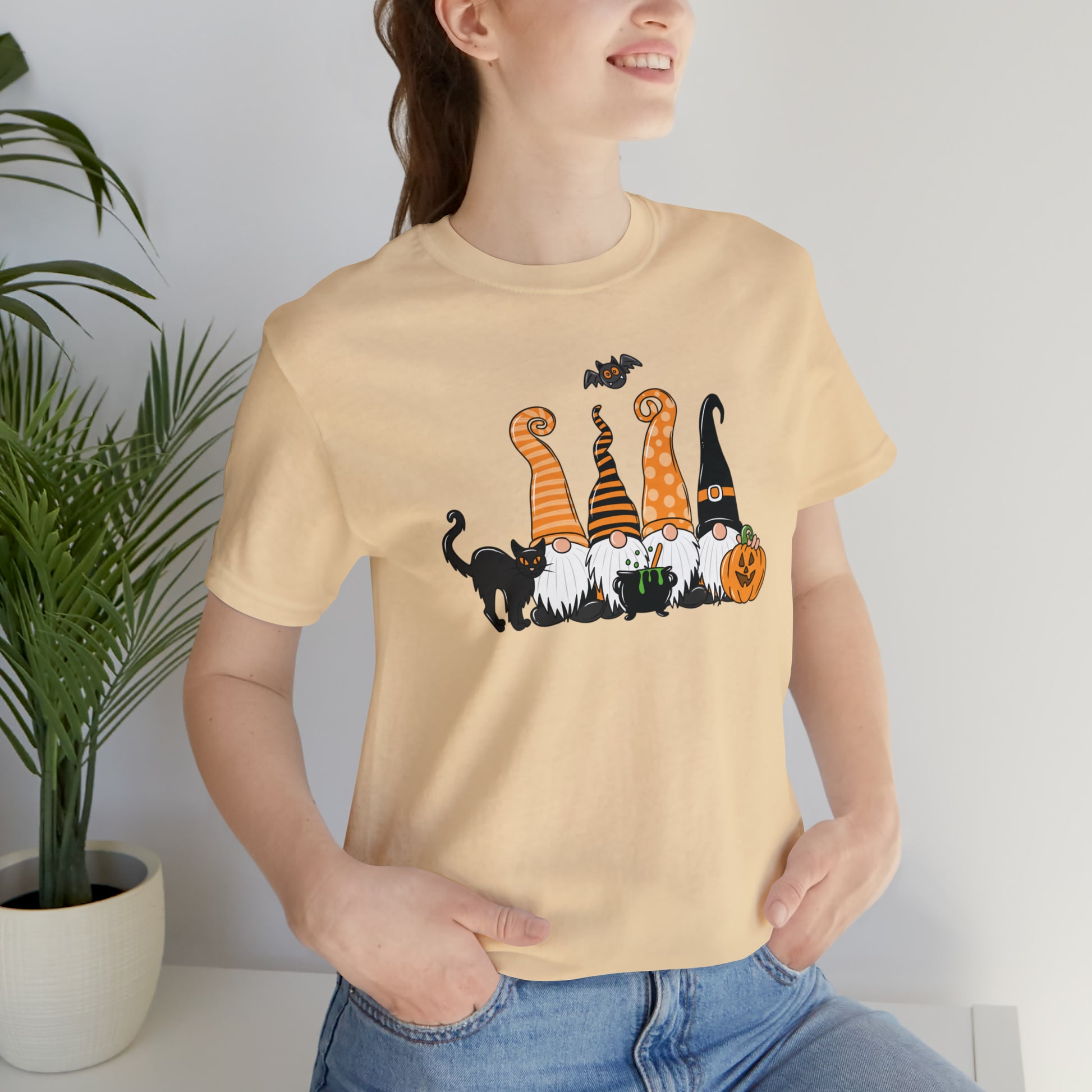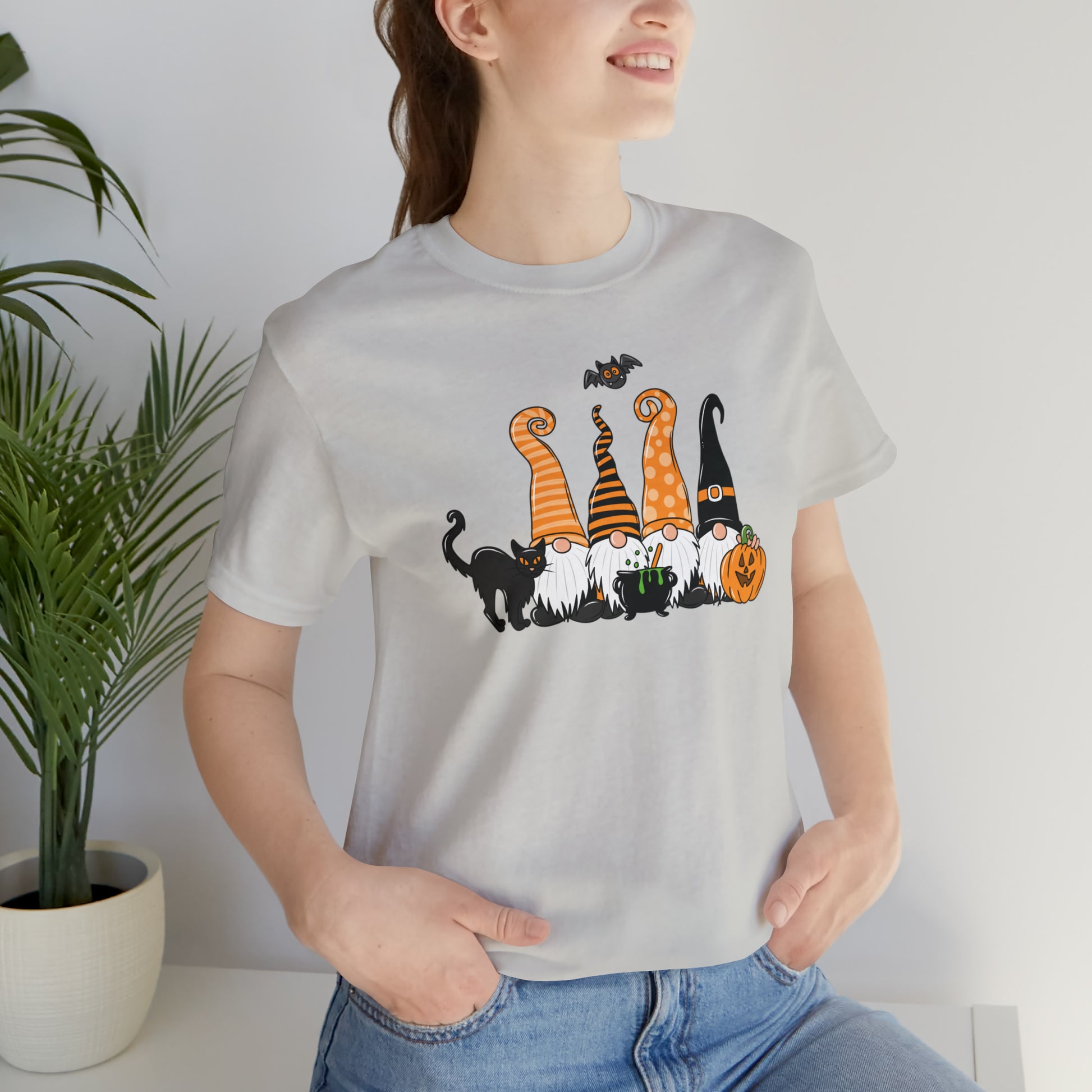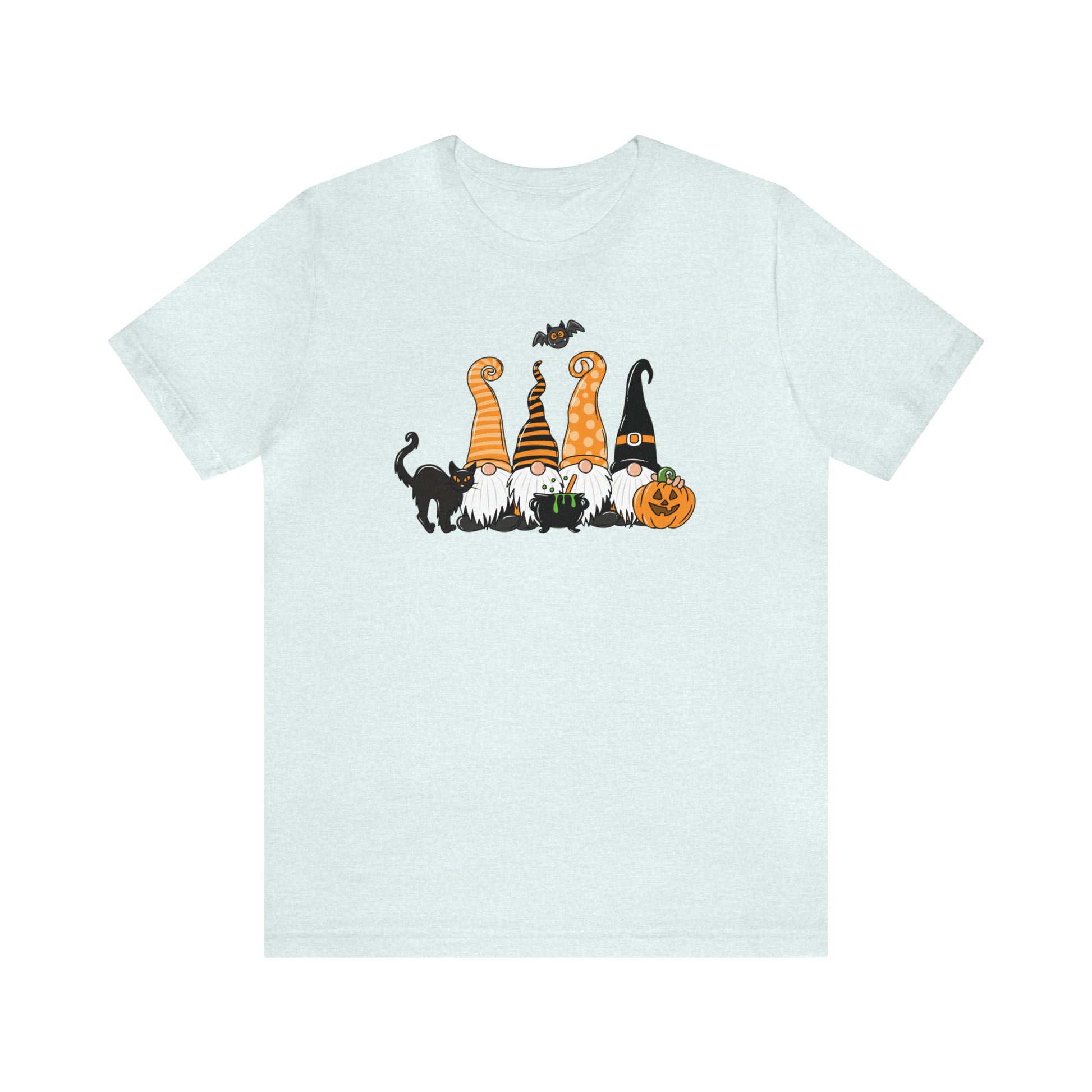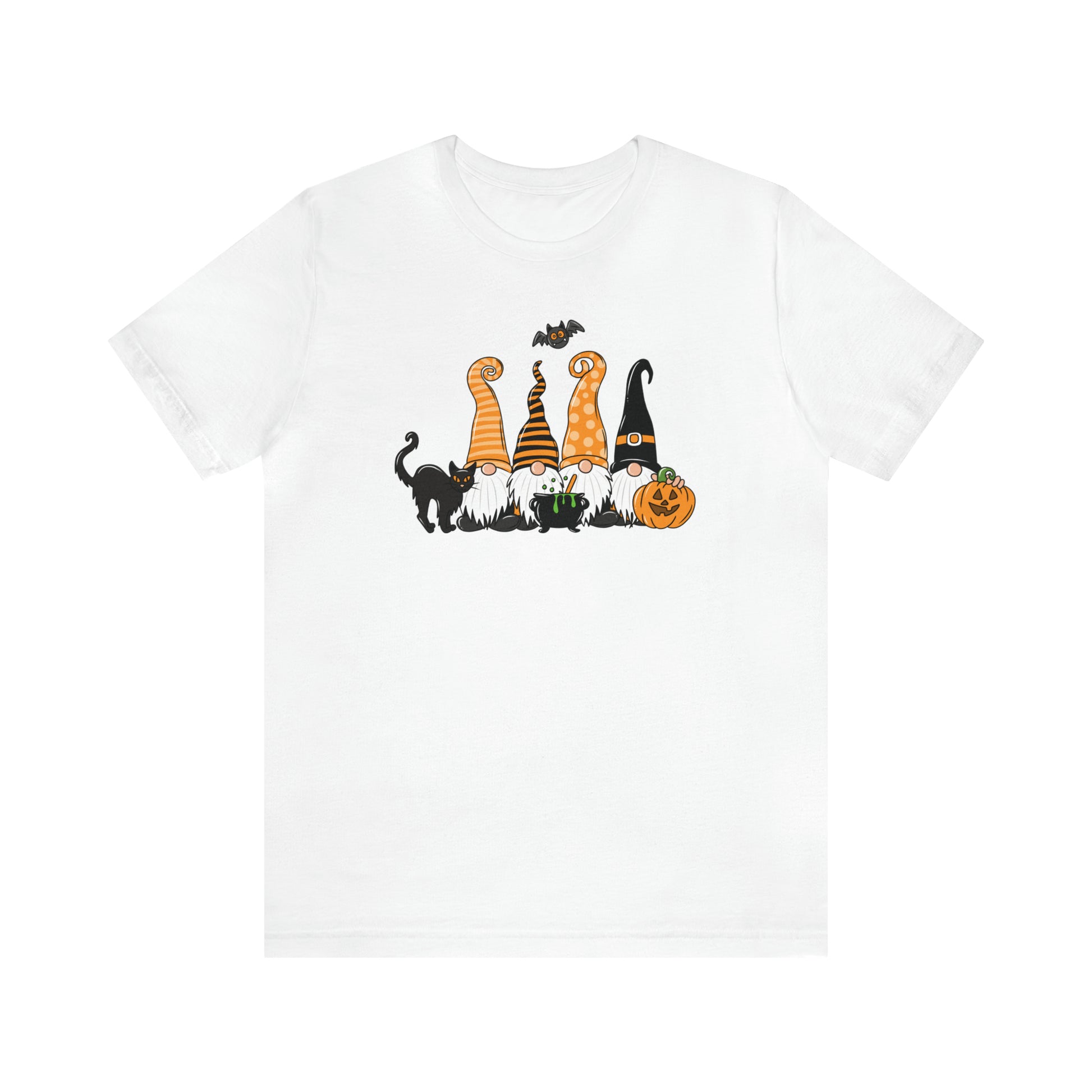 Join the whimsical world of enchantment with our "Witchy Gnome Gathering" Tee! This enchanting t-shirt features four charming gnomes dressed as witches, accompanied by a mischievous black cat, a bubbling cauldron, and a friendly jack-o'-lantern. It's a delightful celebration of all things magical!