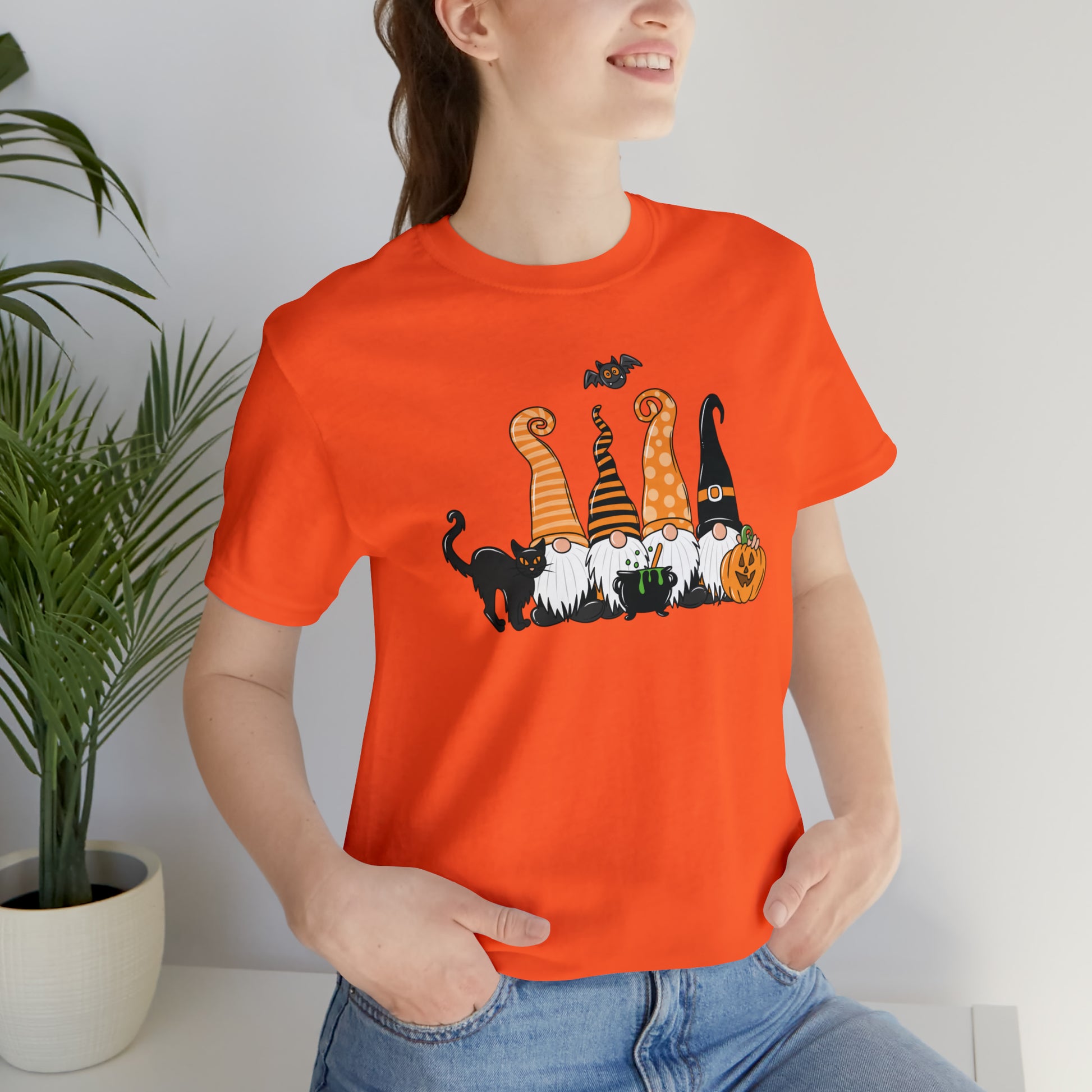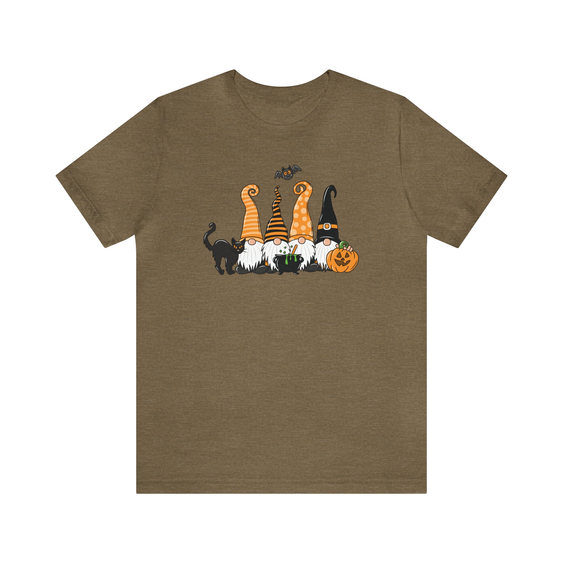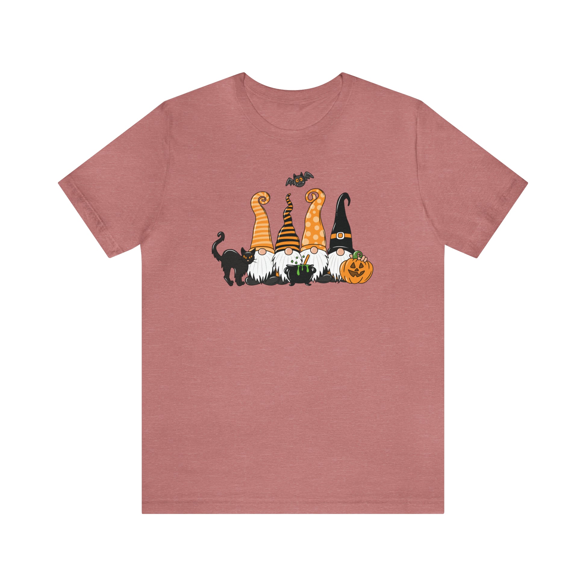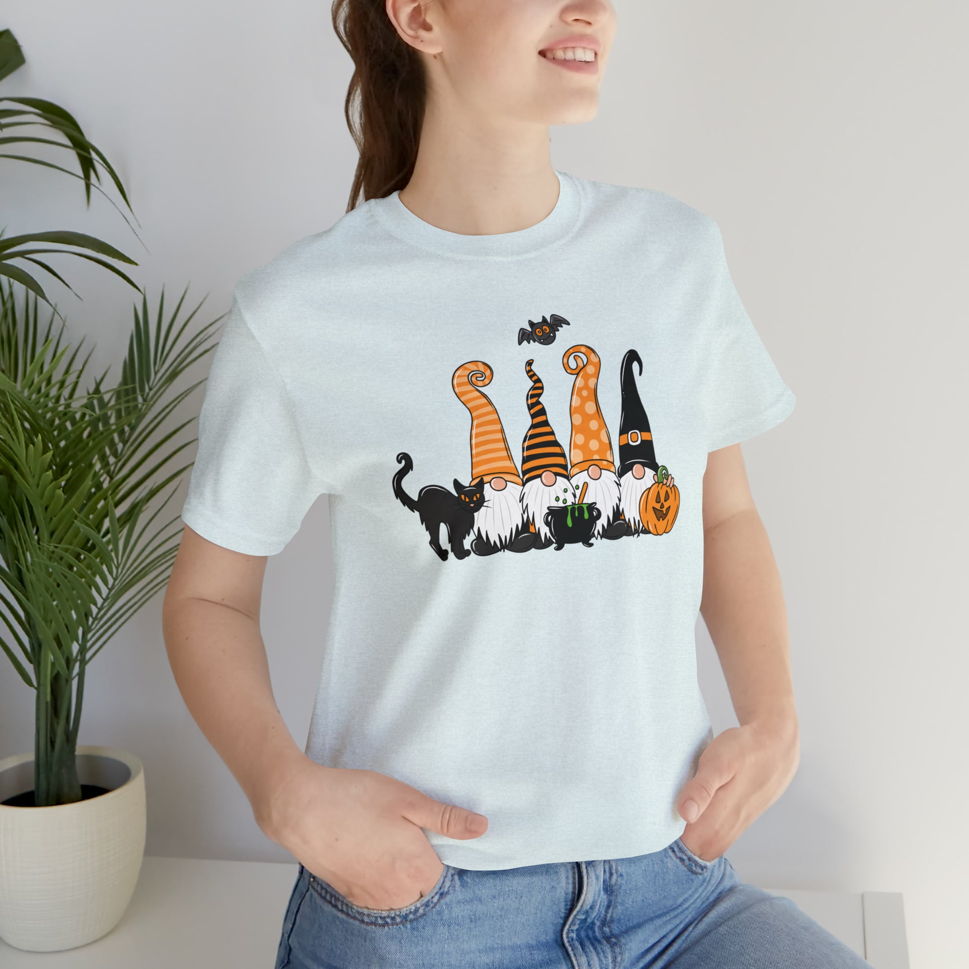 Join the whimsical world of enchantment with our "Witchy Gnome Gathering" Tee! This enchanting t-shirt features four charming gnomes dressed as witches, accompanied by a mischievous black cat, a bubbling cauldron, and a friendly jack-o'-lantern. It's a delightful celebration of all things magical!