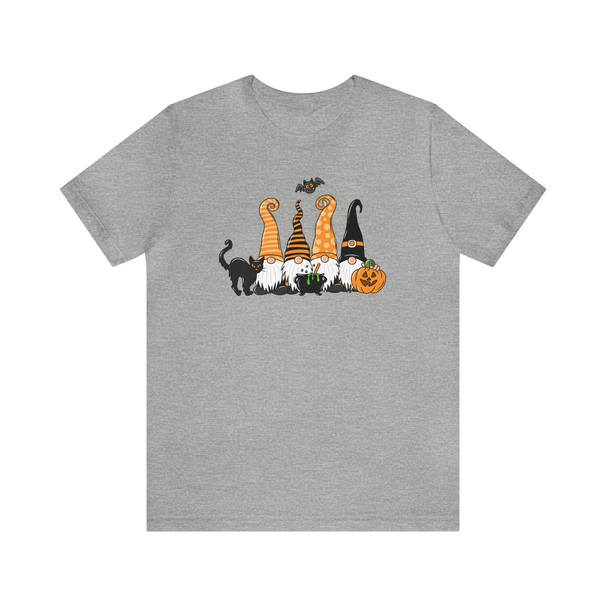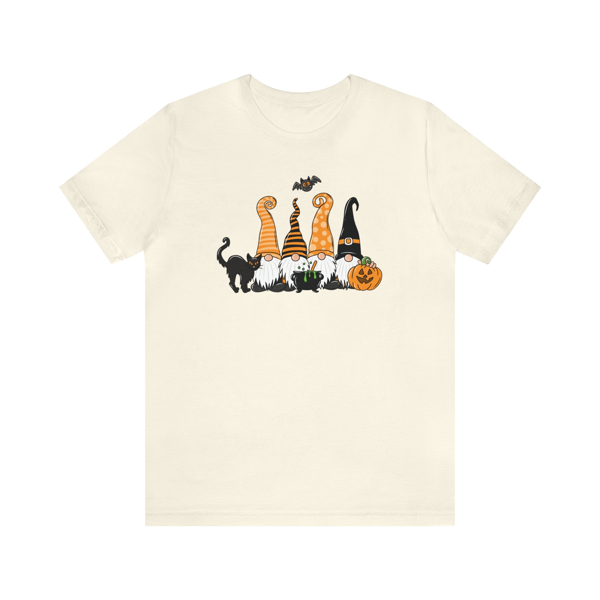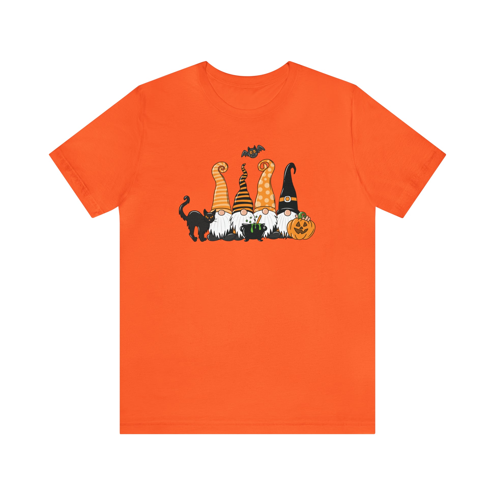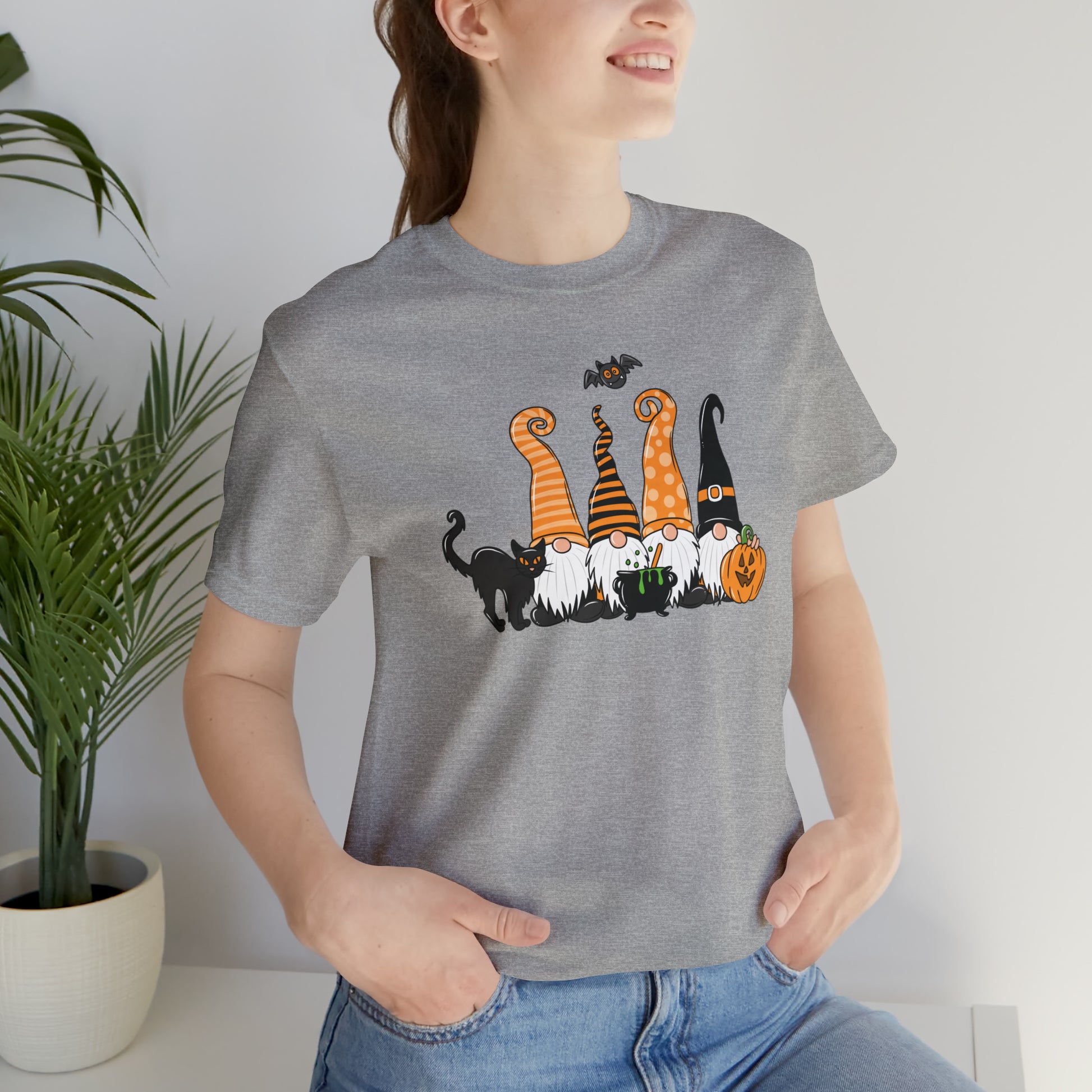 Join the whimsical world of enchantment with our "Witchy Gnome Gathering" Tee! This enchanting t-shirt features four charming gnomes dressed as witches, accompanied by a mischievous black cat, a bubbling cauldron, and a friendly jack-o'-lantern. It's a delightful celebration of all things magical!